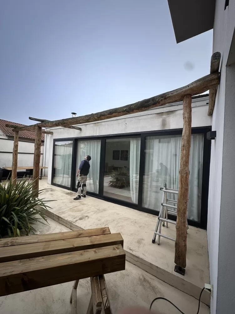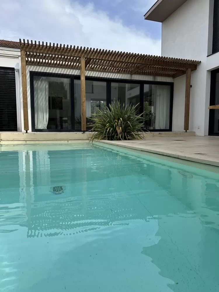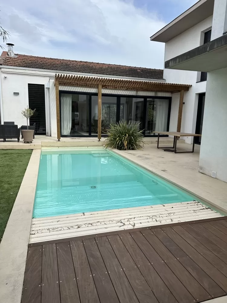 Cette pergola bois sur mesure à Toulouse a été imaginée pour offrir un ombrage naturel, tout en laissant passer la lumière. Grâce à ses lames en quinconce, elle crée un jeu subtil entre ombre et soleil, assurant un confort thermique optimal quelle que soit la saison. L'été, elle protège de la chaleur directe, l'hiver, elle laisse circuler la lumière.