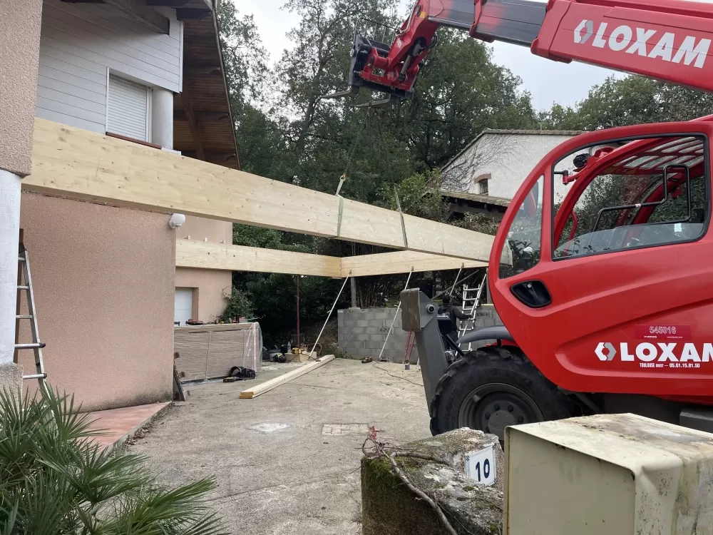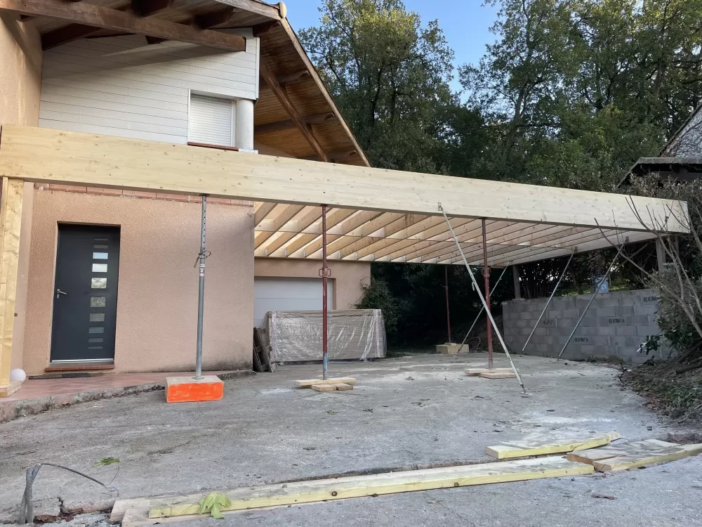 Le carport sur mesure, construit en lamellé-collé, complète cette extension en apportant une solution esthétique et pratique pour protéger les véhicules. Sa conception robuste tout en préservant l'espace extérieur.