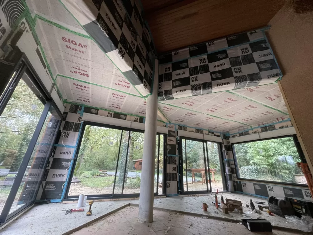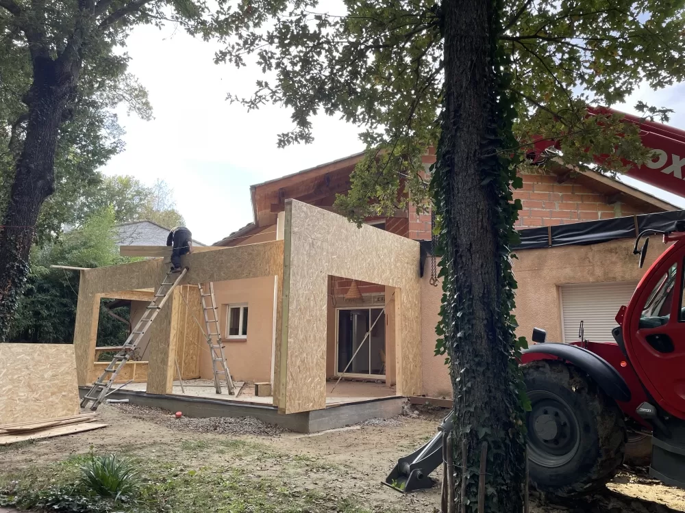 À Mondouzil, à l'est de Toulouse, cette réalisation associe fonctionnalité et design avec une extension hors d’eau/ hors d’air et un carport. Conçue pour répondre aux besoins spécifiques des propriétaires, cette extension s'intègre parfaitement à l'existant grâce à une structure en ossature bois sur-mesure. Dotée de larges ouvertures vitrées, elle offre une luminosité optimale tout en s'ouvrant sur l’espace vert de la maison.